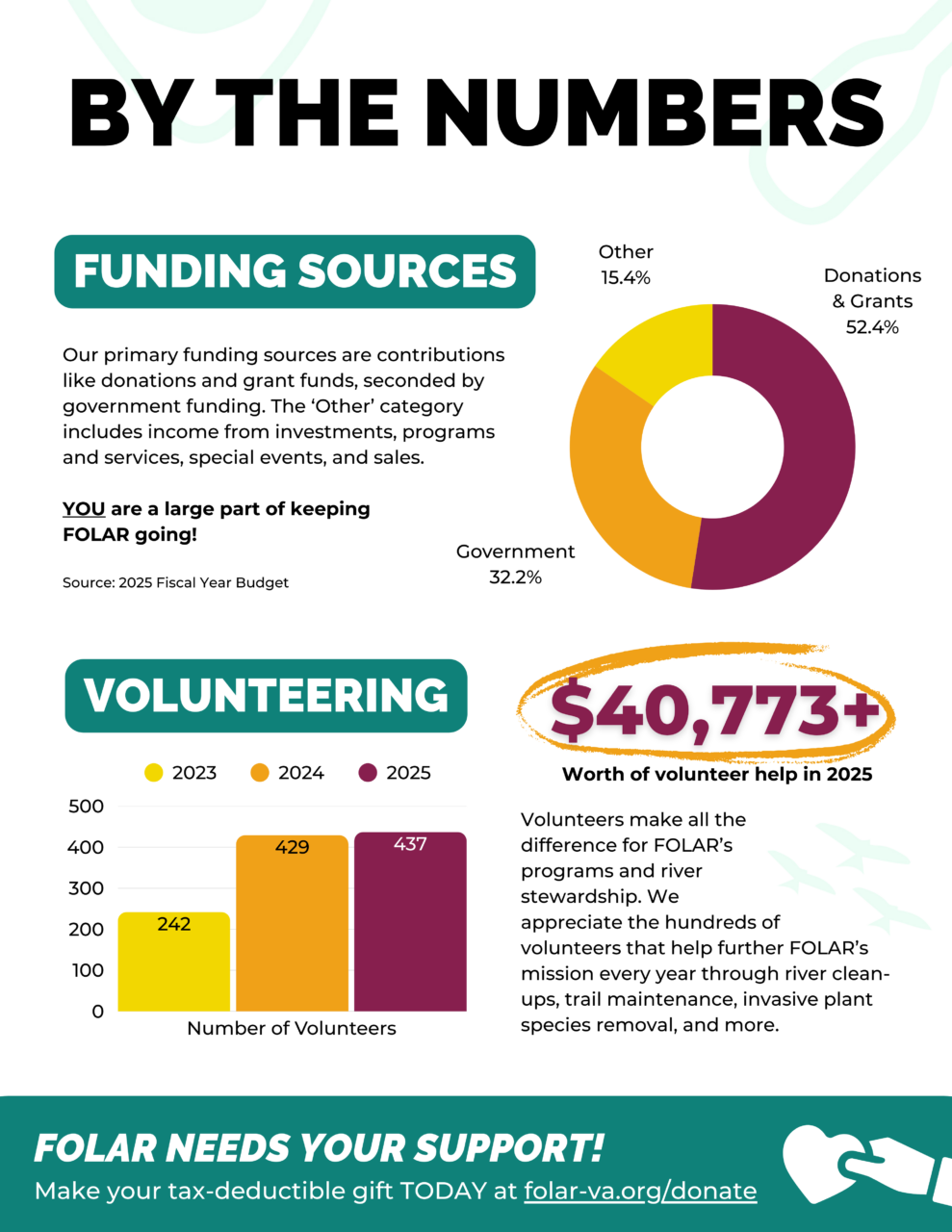 It’s been an exciting year at FOLAR and for the Appomattox River Trail. With the support of our dedicated volunteers and community partners, we’ve been able to get new trail projects off the ground, help restore several segments of the riparian buffer along the Appomattox River, and engage thousands of people of all ages in environmental stewardship, recreation, and conservation across the Tri-Cities region.
