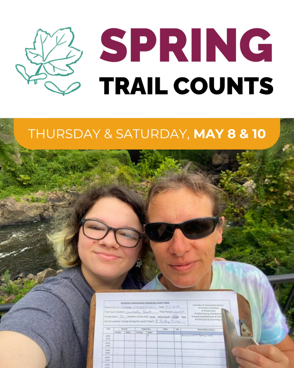 HOW IT WORKS: Volunteers choose a day/time (or two) and location(s) from the list of sites and then count and document the number of people walking and biking along their trail section for a 2-hour period. This is a truly enjoyable and accessible volunteer experience, as it only requires you to sit alongside the trail and gather data on trail usage. Bring a chair, bring a friend if you like, and count folks using the trail.