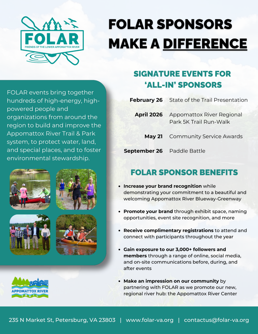 We are grateful for our partners who donate their time, expertise, and treasure to building the Appomattox River Trail and conserving and protecting the Appomattox River for all to enjoy. FOLAR is proud to bring these partners together for a genuine regional effort that will improve the Tri-Cities region’s health and wellness, protect our environment, create active transportation, and drive economic prosperity.