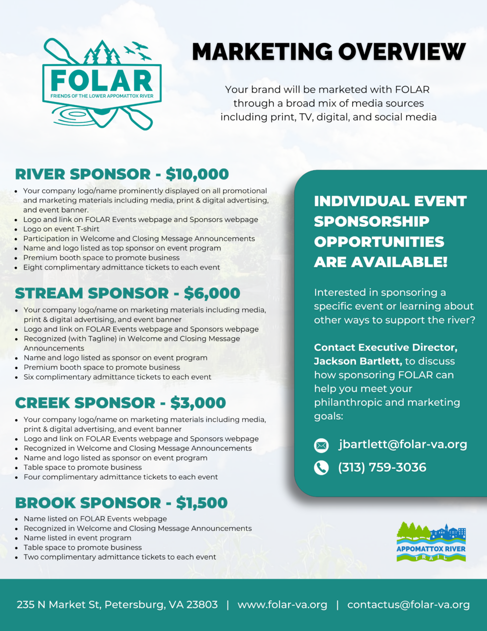 Check out our Sponsorship Opportunities or contact Executive Director, Jackson Bartlett, for more details at jbartlett@folar-va.org.