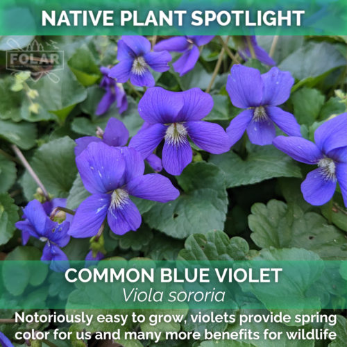 March's Native Plant Spotlight is a springtime powerhouse. Violets bring color to our outdoor spaces, but many more benefits for wildlife. Not only is the nectar of this flower an incredible early resource for our native pollinators, but it is also the host plant for lovely Fritillary butterfly caterpillars, like this one pictured. The plant itself is used as a food resource for wild turkeys, rabbits, several birds, and even humans! Encouraging this flower in our tended spaces can support our natural community.