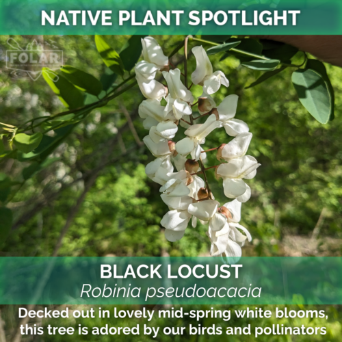 The black locust, while not always perfectly behaved as a garden tree, can be an excellent focal point that provides shade and visual interest to spaces. The white hanging flowers are attractive not only to humans, but to native pollinators like bumblebees and butterflies. Birds also eat the buds and seeds of this tree and use the branches as protective habitat. This tree has a habit of sending out new shoots via underground “suckers,” and combined with the thorns found on the young branches, black locust trees require some attention in garden spaces until a single larger trunk is established. This tree is a host plant to several butterfly caterpillars, including the Clouded Sulfur. Highly recommended for soil stabilization or in places where other trees have struggled!