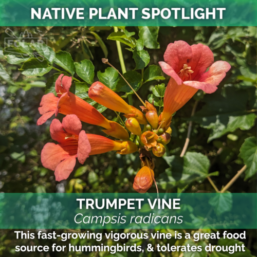 Trumpet Vine, AKA Trumpet Creeper, is sure to split the room for gardeners. Widely considered an aggressive grower, the vine can scale up to 35 feet in full or part sun. It is an invasive species in some other places around the world, but here in Virginia it is a native species with ecological benefits, such as being the host plant for moth species, and a major food resource for our beloved hummingbirds. Perhaps a great alternative to invasive Wisteria species for pergolas and other garden vine uses.