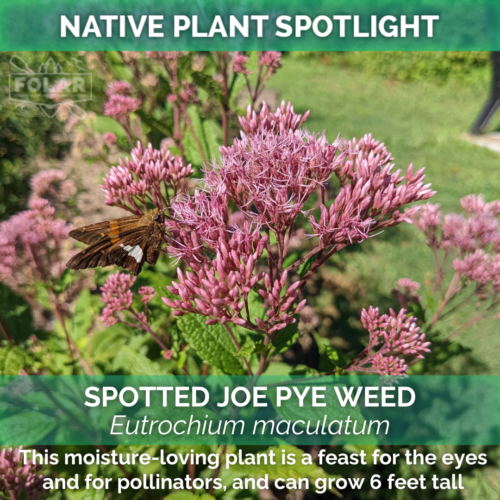 Spotted Joe Pye Weed loves a wet soil and full sun, thriving in marshes, waterside, and ditches or dips in the land. It hosts moth species, including the particularly pretty Clymene Moth, Ruby Tiger Moth, and Ironweed Clearwing Moth. In addition to pollinators, Joe Pye Weed is also appreciated by humans for its long-lived dusty rose-colored blooms that last July through the end of August.