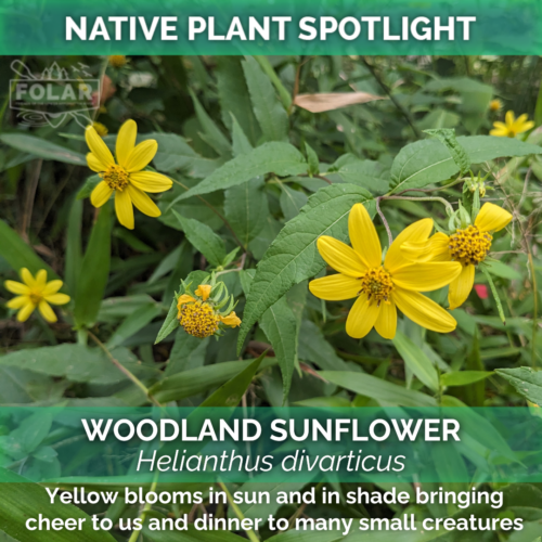 Our native Woodland Sunflower (Helianthus divarticus) and September's Native Plant Spotlight is a frequently-seen bright pop of color along the Appomattox River Trail, even in the shadiest areas. This flower grows to around five feet tall and is a food source for wildlife throughout its growth cycle. It serves as a host plant for beautiful butterflies and moths, its blooms are an important pollen source for our native bees, and its seeds are eaten by songbirds.