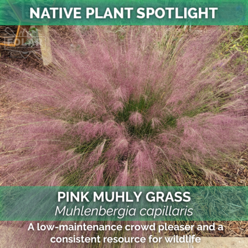 Pink Muhly Grass (Muhlenbergia capillaris) finishes its growing season with a puffy pink cloud of seedheads, making it a popular plant for garden edging and dry, sunny spots. It is the host plant of the Orange Skipperling butterfly (Copaeodes aurantiaca), and it provides habitat for other pollinators, offering shelter and nesting material for wildlife through the winter months.