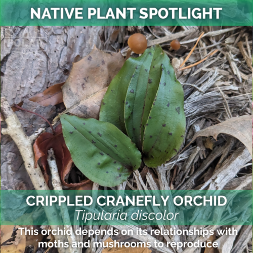 The Crippled Cranefly Orchid is the only orchid in the terrestrial genus Tipularia found in North America. Its family, Orchidaceae, is over 100 million years old! Because its seeds are so tiny, almost dust-like, they rely on the support of existing mycorrhizal fungi systems making nutrients available from rotting wood. Note the mushrooms popping up nearby! The spotted leaves with striking purple undersides pop up in autumn to collect sunlight through the winter when the leaves of trees have fallen. The leaves die back in early spring, replaced by flowers that persist from June to September. The flowers are specially shaped to attach pollen to the eyes - yes, the eyes - of a specific small moth species, who then transfer it off of their eyes to other flowers.