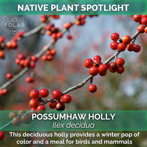 Possumhaw Holly is a small tree or shrub that grows to 15 feet in full sun but can reach 30 feet in shade. In the autumn, the leaves fall without much color change, and the branches are left bedecked with red berries that last through the winter months. In the spring, after being exposed to freezing and thawing, the bitter berries become palatable and get munched by songbirds, gamebirds, and mammals such as opossums and raccoons. Possumhaw holly is seen as a “bird safe” material with which to decorate outdoors for the holiday season.